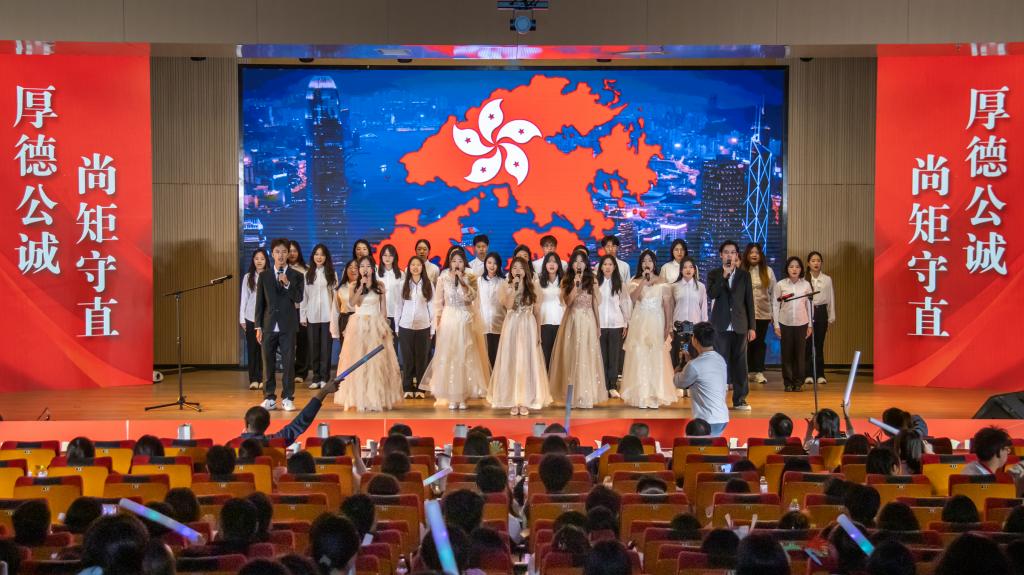 晚会第二篇章由合唱《唱响青春旋律》启幕,歌曲如同一股蓬勃的青春风暴,交织着青春的激情与法治的旋律。而小品《法援在行动2.0》,则以诙谐幽默又不失深刻的笔触,巧妙地将法治精神融入生动的情节之中,让观众在欢笑与思考间,悄然领略到法治文化的独特魅力。合唱《紫荆绽放•有我闪耀》标志着晚会高潮的到来。学院学子在嘹亮歌声中宣告:回归,寓意紫荆花盛开的方向;统一,是中华民族永恒的追求。建设新时代,你我同在。