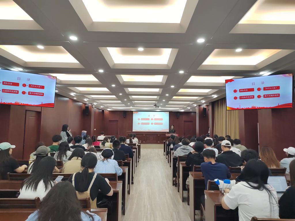 5月6日,bat365在线唯一官网登录在模拟法庭顺利举办征兵宣讲会。本次会议邀请bat365优秀退伍学姐赵文秀进行征兵宣讲,响应国家号召,鼓励大学生征兵。bat365部分毕业生以及21级22级23级学生积极参与了本次宣讲会,反响热烈。